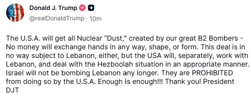 트럼프 대통령은 "이 합의는 레바논과는 어떤 식으로도 연계되어 있지 않지만, 미국은 별도로 레바논과 협력하며 헤즈볼라 문제를 적절한 방식으로 처리할 것"이라며 "이스라엘은 더는 레바논을 폭격하지 않을 것이다. 이는 미국이 금지한다"이라고 강조했다.
